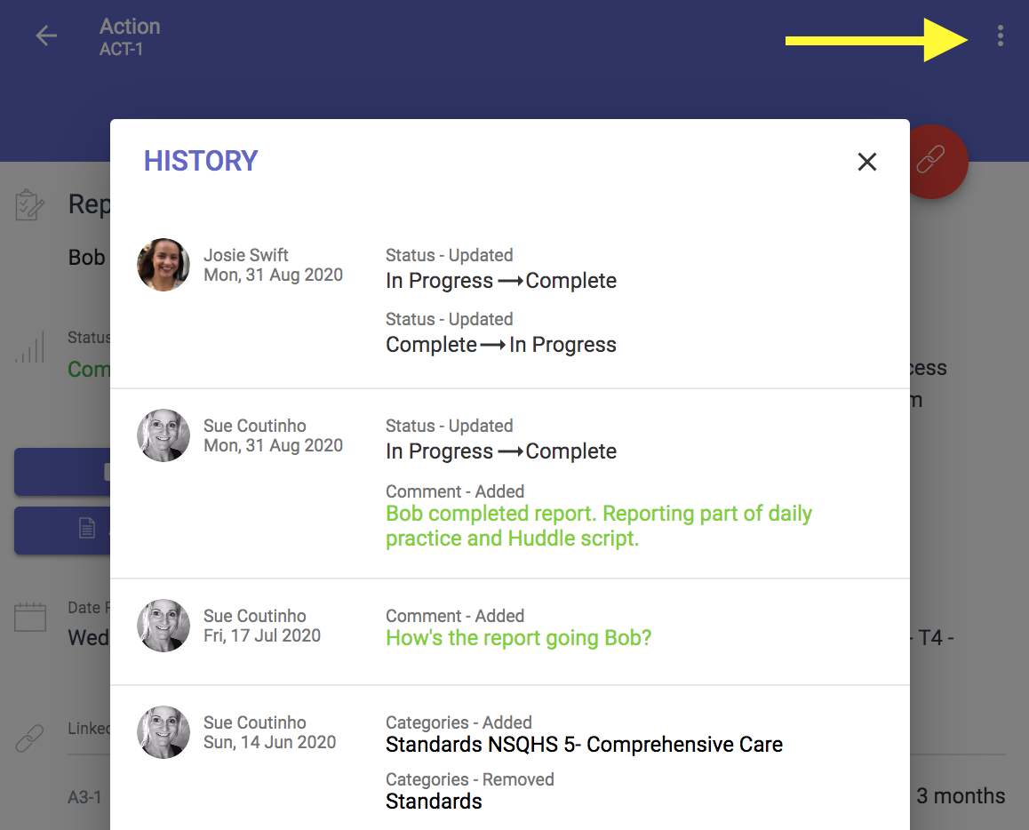 Activity or Checklist History Open your activity -> select the 3 dots in the top right hand corner -> History to see a time-lined list of all added/edited information. Who, What and When....