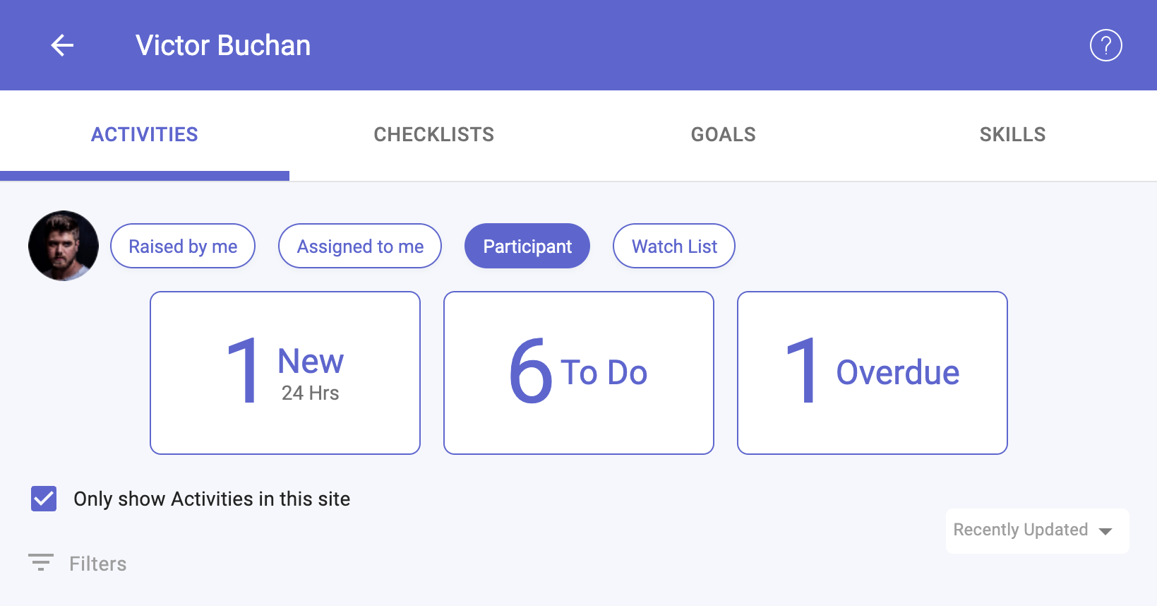 A list of all Activities related to you. There are quick filters for Activities:
