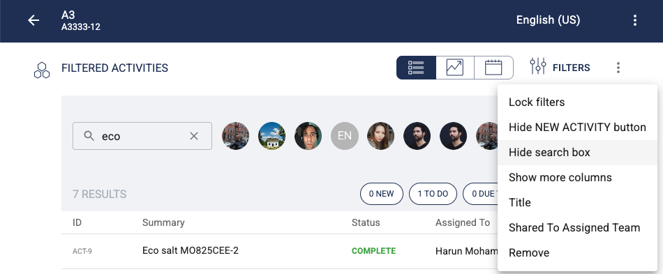 Search using text in Filtered Activity Lists. The vertical dots menu has a new option to Show search box, which will display to the left of the Team Member photos. This becomes an additional filter for the list.