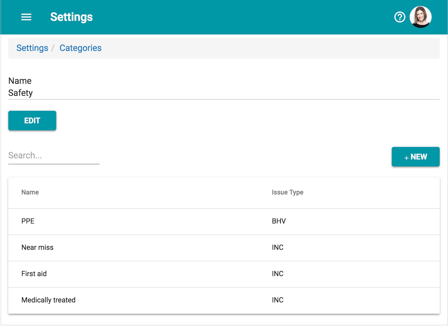 2. Select the category to add subcategories to (e.g. Safety). Then click the button 'New'.