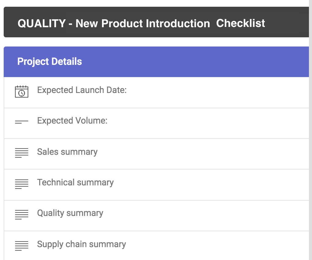 New Product Introduction Checklist, creates a structured approach to the implementation of a new 'product line'. Visibility and collaboration across Sales, Safety, Technical, Quality and Supply Chain Teams ensuring your 'business ready' on launch date.