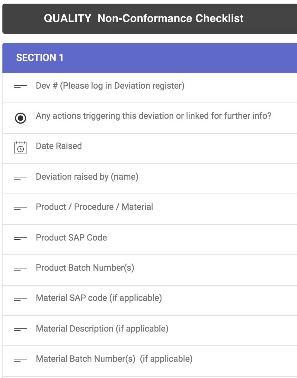 Building a scripted checklist to raise and capture a non-conformance in a timely manner. Investigate, approve and action corrective measures. Follow up and close when complete. Script governed by the organisations quality standards providing a structured approach.