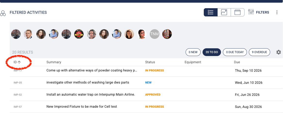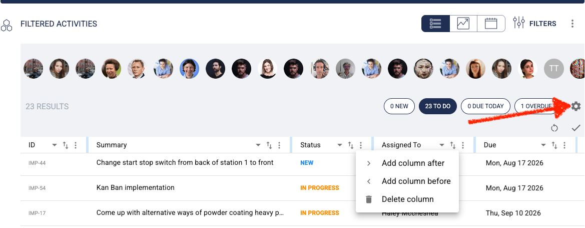 - Click on the column header of the column you wish to sort by (e.g., Status or Assigned To).
