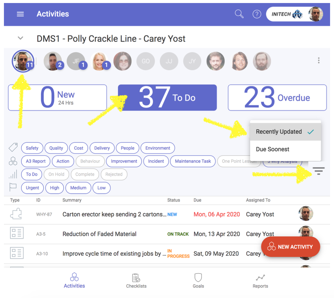 - Sub-filters: Category (SQDCMS), Activity Type, Status and Priority