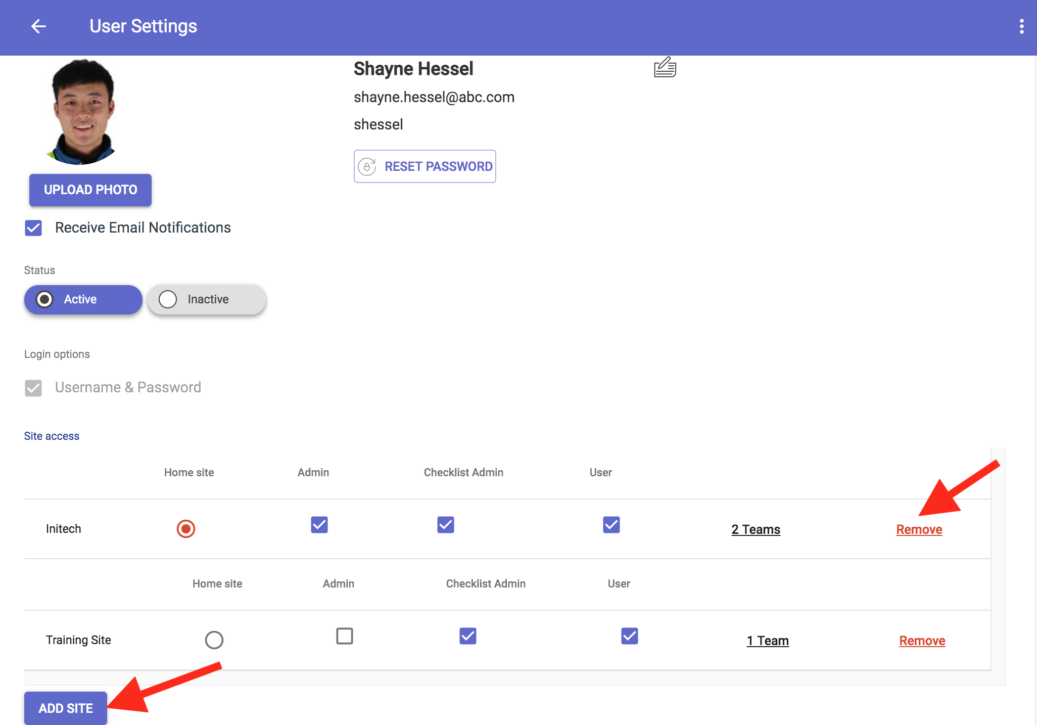 To Remove a user from a Site; in the side menu select Team Members -> User (pic below) select remove on the right hand side of the Site. If removing a user from a Home Site you must select another Home Site first.