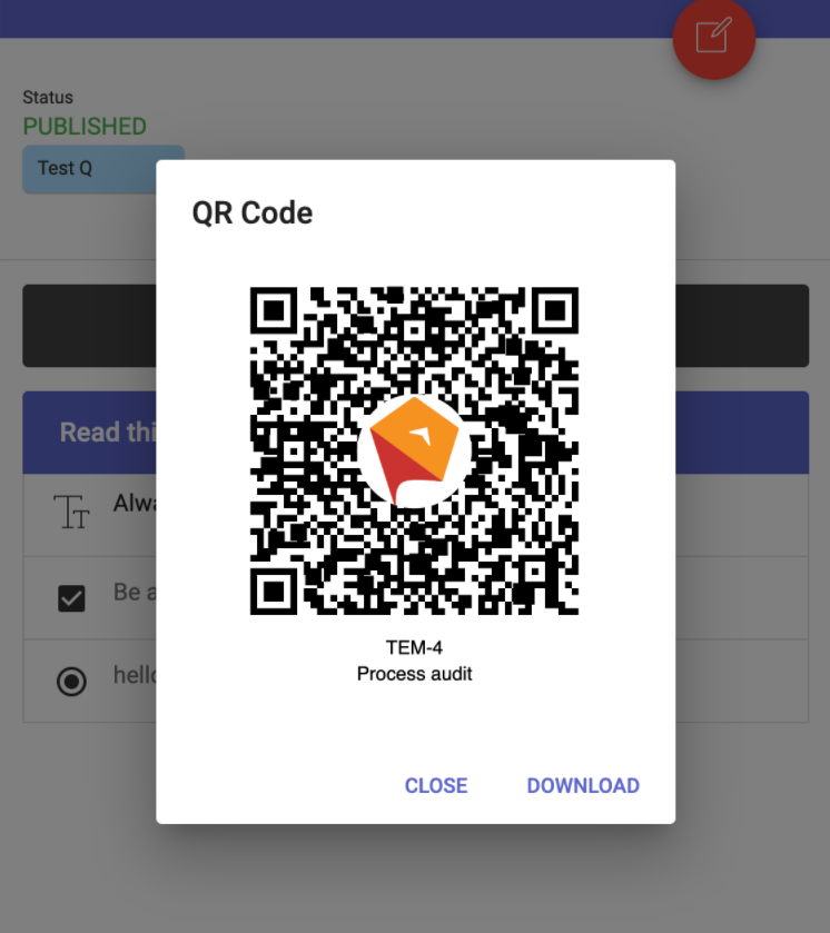 Checklist templates have a QR code behind the 3 dots menu. Checklist templates can be accessed by Checklist Admin's. Download, print and place wherever the checklist needs to be done, e.g. daily Operations, Prestart, AM, PM type checks