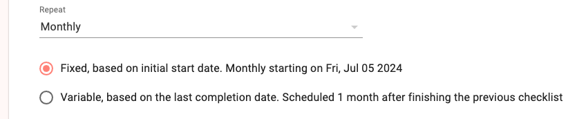 - Variable.This is based on the completion date of the previous one. For example, a Monthly schedule starts on the 5th, but doesn't get completed until the 14th. The next one will be scheduled on the 14th of the following month. This is sometimes referred to as a Floating schedule.