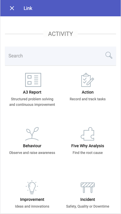 2. Select the appropriate follow-up Activity or Checklist. It could be a Five Why Analysis (for root-cause analysis) or an Improvement, or any other Activity type.